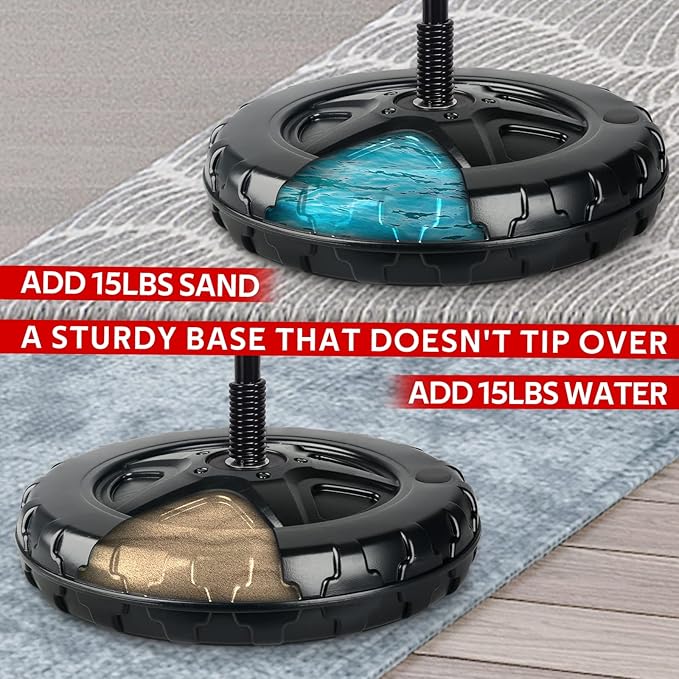 - Punching Bag for Kids: Our kids boxing set includes an upgraded inflatable punching ball, 2-pack comfortable kids boxing gloves, a sturdy wheel-designed base that can hold 15LBS of water and sand, an adjustable stand (size: 27.6-43.3 inches), an inflatable pump, and installation accessories. It is suitable for kids aged 5-10 with different heights.
