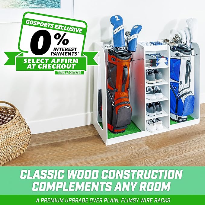 GoSports Premium Wooden Golf Bag Organizer and Storage Rack - Black, White or Brown Finish - Holds 2 Golf Bags