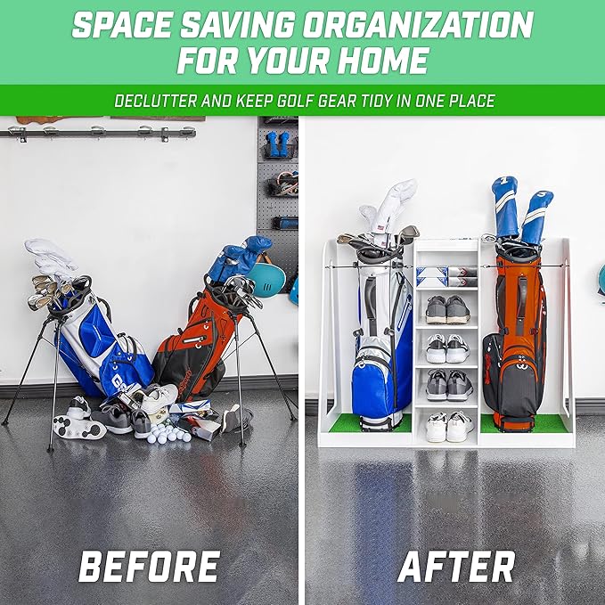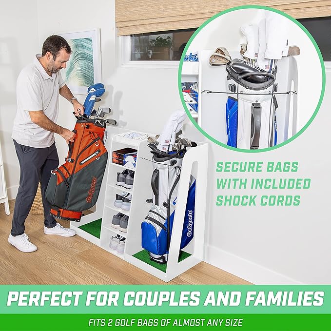 - NEAT ORGANIZATION: Universal design holds 2 golf bags of nearly any size with optional safety cords to keep them secured; Shelves can hold 4-5 pairs of golf shoes (virtually any size) with room for accessories like balls, tees, towels, etc