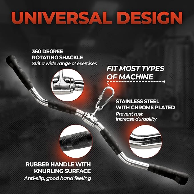 - KNURL TEXTURED RUBBER HANDLES FOR MULTIPLE EXERCISES: The knurled rubber covers on our tricep bar handles enhance workout comfort and prevent slipping, while the 360-degree rotating shackle provides smooth rotation for exercises targeting the lats, triceps, biceps, back, shoulders, and abs, helping improve balance as well.