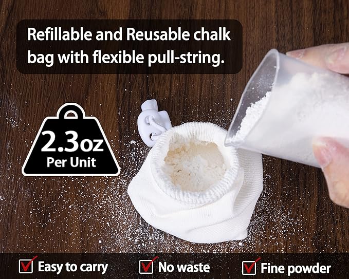 - Refillable and Reusable: The pouch has pull-strings to keep it closed tightly. You can un-cinch the drawstring and fill it with any chalk you wish, and cinch the drawstring shut again. Easy peasy.