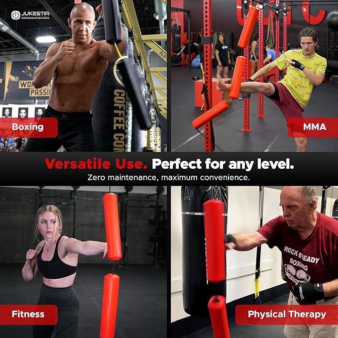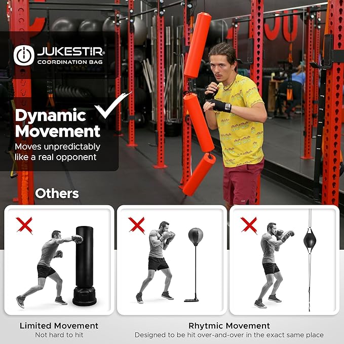 - ๐ช๐ถ๐ป ๐ฌ๐ผ๐๐ฟ ๐๐ถ๐ด๐ต๐: Jukestir Coordination Bag is the perfect boxing equipment for training at home that boosts your speed, power, and coordination, simulating a sparring experience that sharpens your footwork, fight IQ, and reaction time.