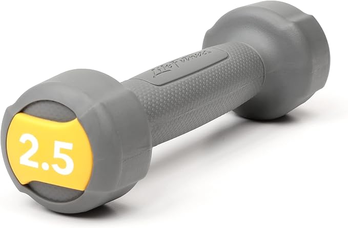 - The 1 (one) 2.5 pound dumbbell comes in light grey with a yellow weight plate for easy weight identification.