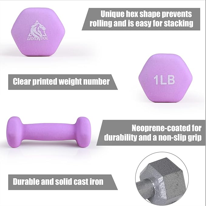 - Comfortable Grip and Anti-Roll Design: The neoprene coating on LIONSCOOL dumbbells offers a comfortable and secure grip and protects fitness equipment from getting damaged. The hexagonal shape of the dumbbell heads prevent the dumbbells from rolling away when setting them down to perform other exercises.