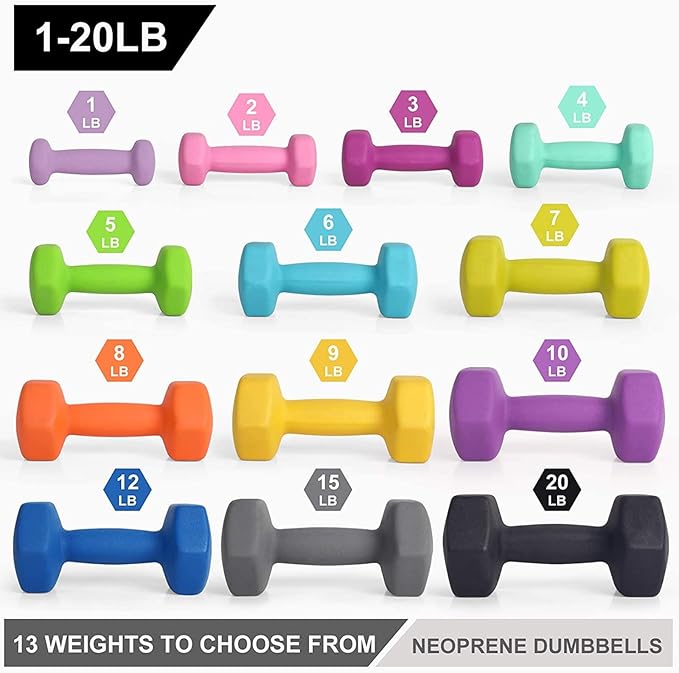 - Choose from 13 Different Sizes:LIONSCOOL neoprene coated dumbbell weights are sold in pairs and available in 1, 2, 3, 4, 5, 6, 7, 8, 9,10,12, 15 and 20 pounds, which allow you vary the intensity of your workouts. Each Dumbbell is color coded with clear printed weight number on the end caps for easy and quick identification.