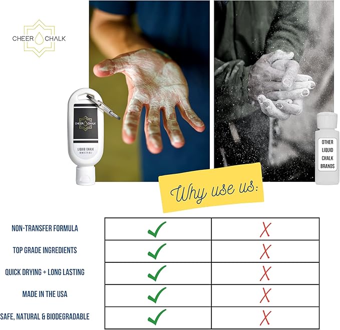 • NON-TRANSFER FORMULA ~ Our unique non-transfer liquid chalk formula, binds the magnesium to the fatty acids in the skin. Powdered gym chalk and cheaper liquid chalk alternatives, create dust that can cause skin, eye, and lung irritation. Cheer Chalk leaves no powder, and no mess; just clean stunts!