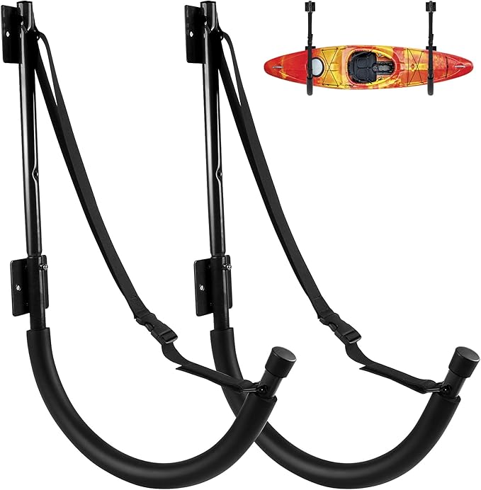 - 【Stronger and Safer】kayak storage rack measures 25.6" x 14.3" . The kayak wall hanger is designed with foam padding , which can well protect storage items from damage or scratch, and locking kayak in place to keep from sliding. kayak wall storage rack adjustable nylon straps measure 6.6 ft, You can adjust the length of the kayak storage hooks strap, make wall-mounted kayak hanger fits the hanging object’s size,and make sure your kayak or stand-up paddleboard will not fall off the rack.