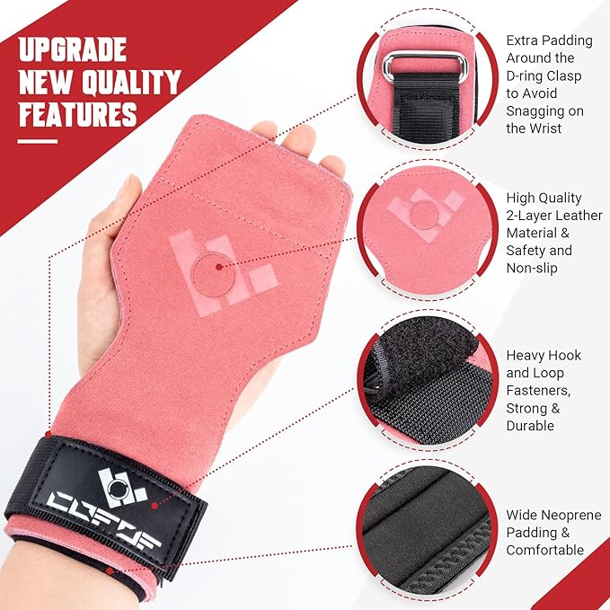 - Upgraded Weightlifting Wrist Strap: Our lifting wrist straps are made of double layers soft leather which is high quality and ergonomically designed to fit your hands and provide better grip. Adding extra padding around the D-shaped metal ring clasp keep your wrist from being squeezed and feel painful. Weightlifting strap with high-density hook and loop can be easily worn on the wrist, and take off and put on freely by yourself. Widened neoprene pad makes you feel comfortable.