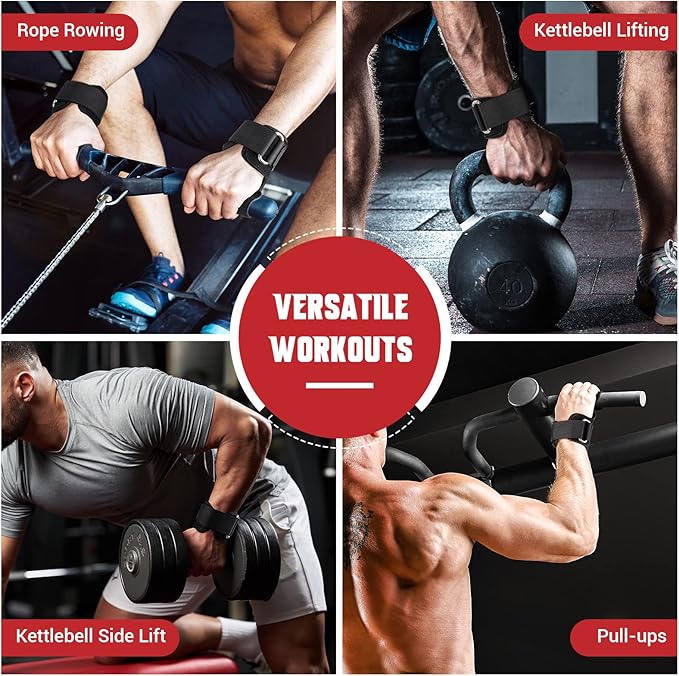 - Upgraded Weightlifting Wrist Strap: Our lifting wrist straps are made of double layers soft leather which is high quality and ergonomically designed to fit your hands and provide better grip. Adding extra padding around the D-shaped metal ring clasp keep your wrist from being squeezed and feel painful. Weightlifting strap with high-density hook and loop can be easily worn on the wrist, and take off and put on freely by yourself. Widened neoprene pad makes you feel comfortable.
