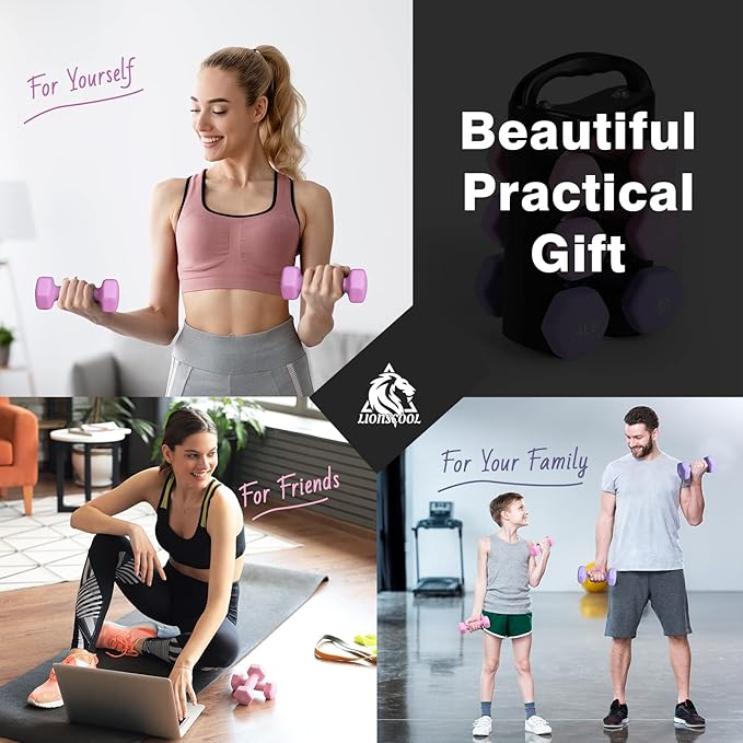 - Graceful Present for Your Friends / Family: Set includes pairs of 2lb, 3lb, 4lb neoprene coated hex dumbbells with a unique dumbbell rack for storage, which is perfect for daily workout targeting specific muscles. Light bright color and soft touching feel will please everyone. It also comes with a poster to help plan your workout.
