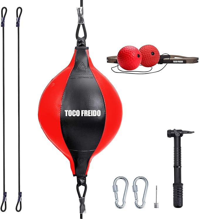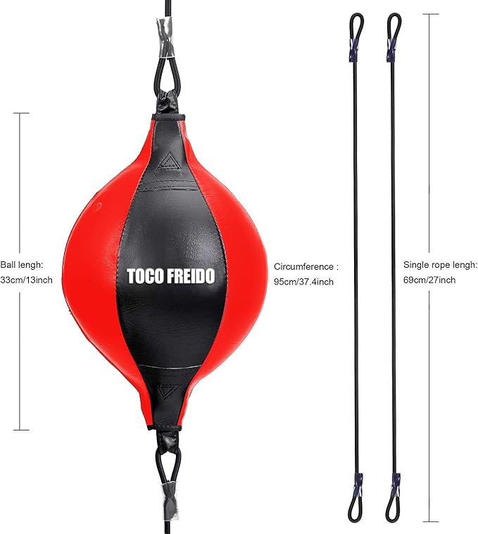 - 【PREMIUM DOUBLE END PUNCHING BALL FOR YOUR GYM】TOCO FREIDO Speed Bag made of PU Cow hide leather material is lined inside with 4 layers of poly cotton material. Boxing ball adopting rubber thickened inner bladder, anti-leakage, double stitched and reinforced with triangle seams,tight gas nozzle design, inflatable convenience.