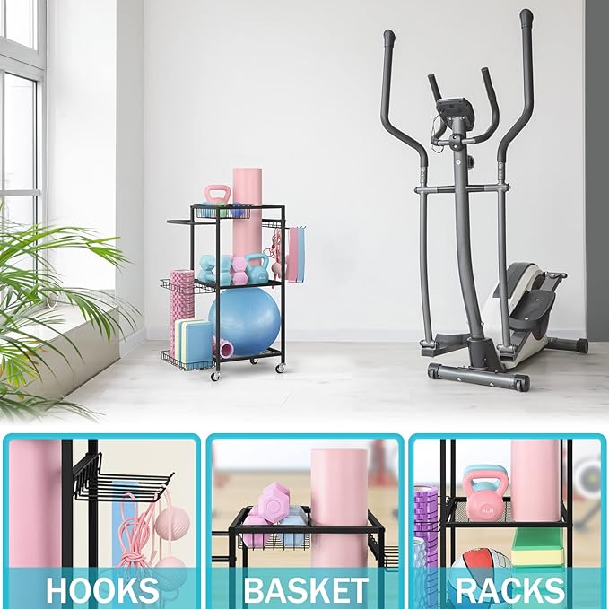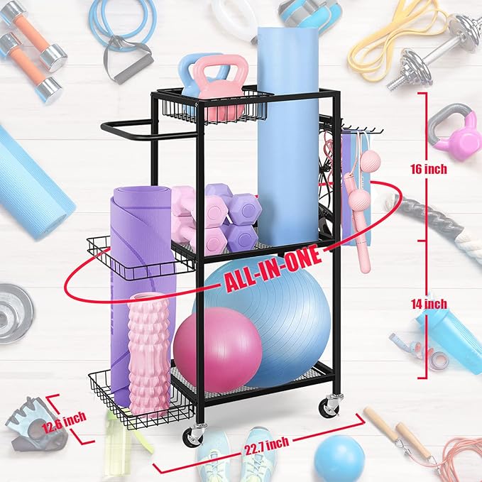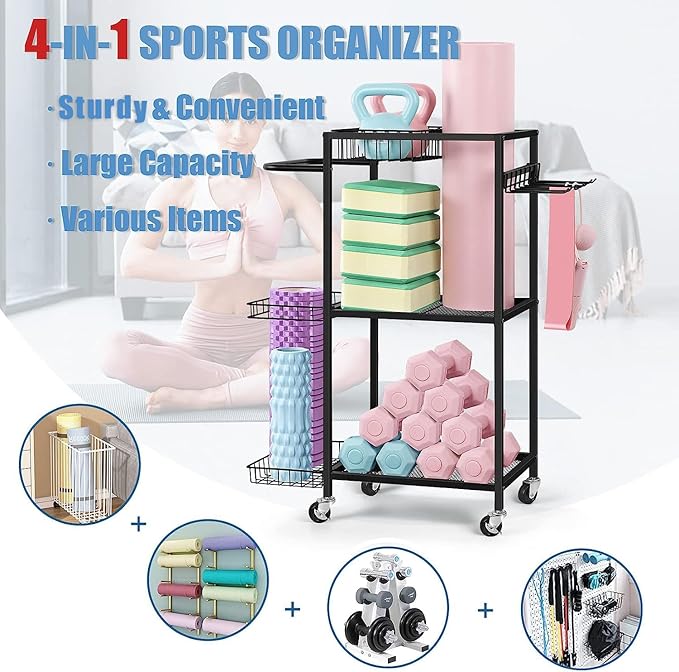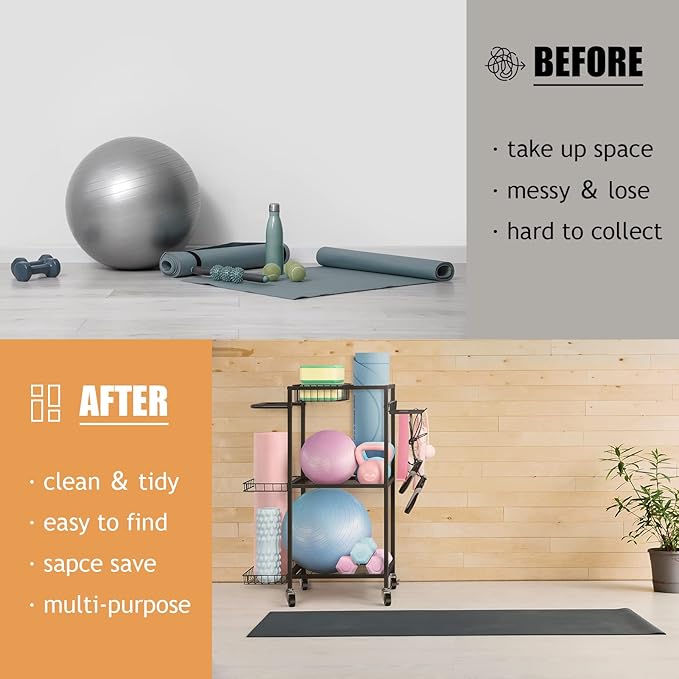 - MULTI-PURPOSE STORAGE RACK: This workout storage organizer can help to store your yoga mat, dumbbells, kettlebells, yoga brick, resistance band,roller wheel, foam roller etc. Makes your room clean and tidy, perfect for bodybuilders