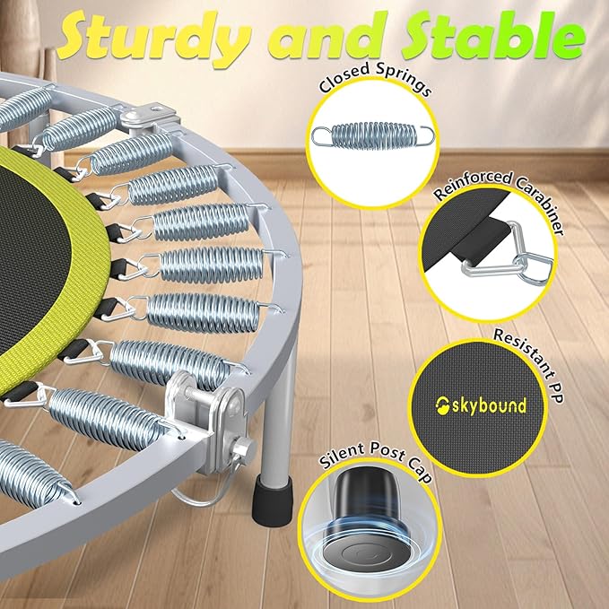 - FOLDABLE, STORABLE & LIGHTWEIGHT - Requires no tools and provides a silent bounce on our trampoline indoor, all while making no compromises on quality or your fitness goals. Adjustable for different heights and ages. Equipment holds ASTM F381-16 safety standard certificate.
