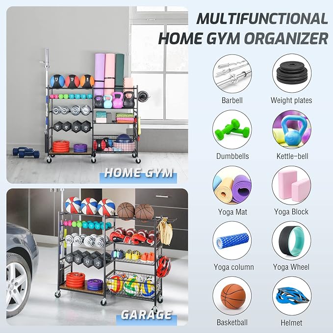 - 【Multifunctional Home Gym Organizer】: Organize your exercise gears and sports equipment with ease using this versatile storage rack designed for dumbbells, kettlebells, barbells, yoga mats, medicine balls, basketballs, footballs, gloves, skateboards, and more.