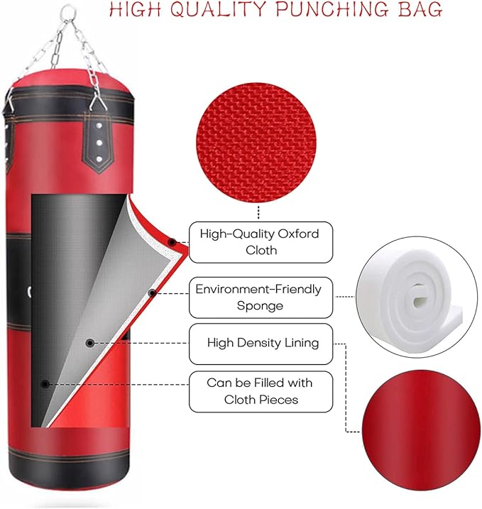 - 【 PREMIUM MATERIAL 】: The 3.28FT heavy punching bag is made of durable oxford and PU leather. The liner is a thickened high-elastic sponge, featured with fixed 3 screws, 4 reinforced triangular hooks, bottom is cross stress bands can bear more weights. Kind tips:The chain of the puching bag is inside the boxing bag zipper