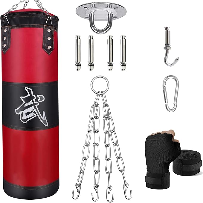 - 【WHAT YOU WILL GET】: This heavy bag set includes 1 x empty punching bag, 1 x 4-pannel steel chain, 1 x connecting carabiner, 1 x boxing bag hanger, 1 x expansion screw hook, 4 x expansion screw, 2 x Wrist band. It's the ideal choice for your family or kids to boxing and do Martial Arts, Muay Thai, Karate, Taekwondo, etc. workouts.