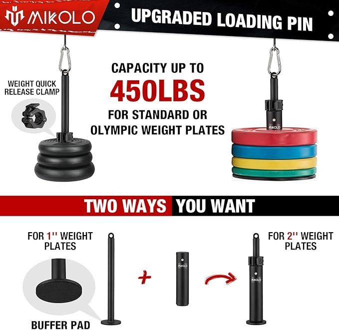 - [Professional Components for Safe and Effective Training] The breaking-proof ball design of the cable and heavy-duty alloy buckle prevent the rope from breaking and provide adequate protection. The upgraded detachable loading pin with a barbell clamp can fit 1''/2'' standard or Olympic weight plates, and the sponge at the bottom of the loading pin protects your floor from damage. With a maximum weight load capacity of up to 450 lbs, you can push yourself to your limits.