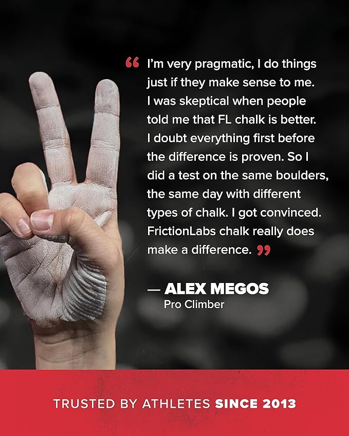 - TRUSTED BY THE BEST: Friction Labs is the only chalk endorsed by champions in multiple sports like rock climbing, tennis & powerlifting. Our chalk provides the long lasting moisture absorption you need to keep performing your best.