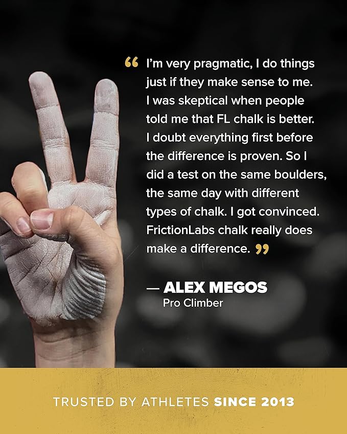 - TRUSTED BY THE BEST: Friction Labs is the only chalk endorsed by champions in multiple sports like rock climbing, tennis & powerlifting. Our chalk provides the long lasting moisture absorption you need to keep performing your best.