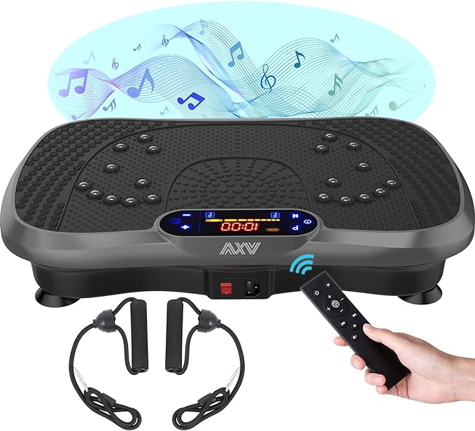 - ✅WHY WE CHOOSE AXV VIBRATION PLATE: Can be connected to phone via BT and used as BT speaker; Magnet health massage function; LED display shows time, speed and burnt fat making your workout visible; Compact size can be used anywhere & easy to carry and store; Anti-slip coating designed;Enhanced upgraded Ergonomic design shell ensures more durability and stability; Comes with Remote control ,Resistance Bands and detailed manual...everything you need.
