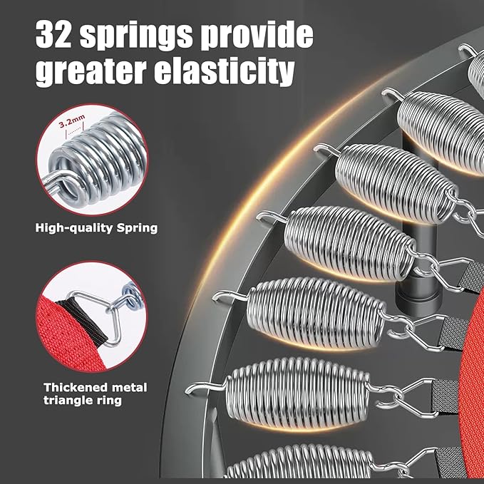 - 【450 LBS Heavy-Duty Spring Rebounder - Adults & Kids Safe】Engineered with 40 high-tension springs (not bungee cords!), this professional rebounder trampoline for adults supports up to 450 lbs – 35% higher than average. The spring system absorbs impact 3x better for joint-safe cardio, whether you're doing HIIT workouts or kids are bouncing after school.
