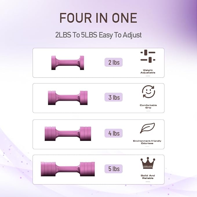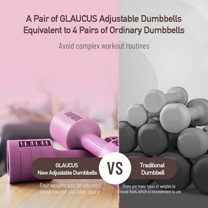 - 【FOUR IN ONE】: One GLAUCUS dumbbell can be adjusted from 2 LBS to 5 LBS, with each weight is 0.5 LBS. Having one GLAUCUS dumbbell is equivalent to having four dumbbells of different weights. Suitable for all training styles and for members of the family with different training levels.(You are buying a pair of dumbbells. The pack contains two dumbbells and 12 removable weights.)