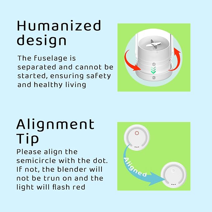 - SMART LOCKING PROTECTION: The portable blender for milkshakes and smoothies features built-in magnetic induction protection. If the cap or base is not tightened, the blender will not work properly. It will also flash a red light as a reminder to prevent accidents from accidentally starting the blades.
