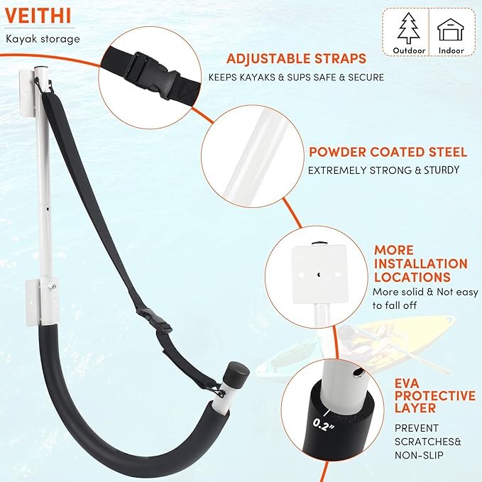 • 【Multi-function】Great for organizing kayaks, SUP and surfboards, skis and snowboards, skateboards, longboards, paddleboards, folding chairs, ladders, bicycles, tools, garden hoses, wood, sports equipment and other large items. You can choose two or four kayak wall hooks as a match to hang heavy objects. The kayak storage hooks are available in black, white, yellow, orange, blue, green and other colors, rust-proof and beautiful.