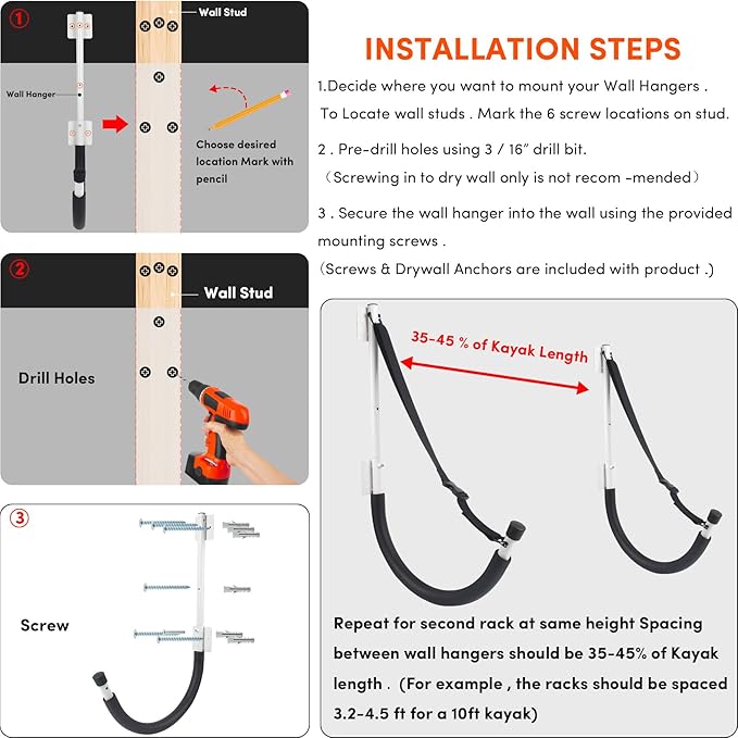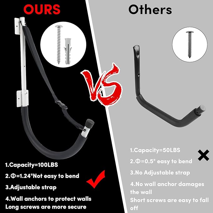 • 【Space-saving Kayak Wall Mount Storage】 The package includes 2 kayak rack storage, 14 screws and 12 anchors, the updated screws are longer and stronger . Kayak wall mount hooks Suitable for indoor or outdoor use in the garage, shop or home. Kayak hanging rack fit neatly on drywall, wall studs, and other wall types, freeing up space on the ground.