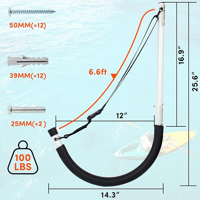 • 【Stronger and Safer】kayak storage rack measures 25.6" x 14.3" . The kayak wall hanger is designed with foam padding , which can well protect storage items from damage or scratch, and locking kayak in place to keep from sliding. kayak wall storage rack adjustable nylon straps measure 6.6 ft, You can adjust the length of the kayak storage hooks strap, make wall-mounted kayak hanger fits the hanging object’s size,and make sure your kayak or stand-up paddleboard will not fall off the rack.