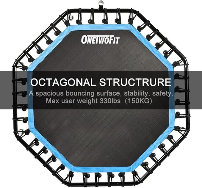 - 【Stable Structural Design】This fitness trampoline is made of STRONG PP MESH,anti-wear and tear resistant octagon rebounding surface,joint-friendly suspension by 40 bungee ropes,thick steel pipe which is 1.2"(30MM) of the diameter, 8 legs supports user up to 330 pounds(150kg)
