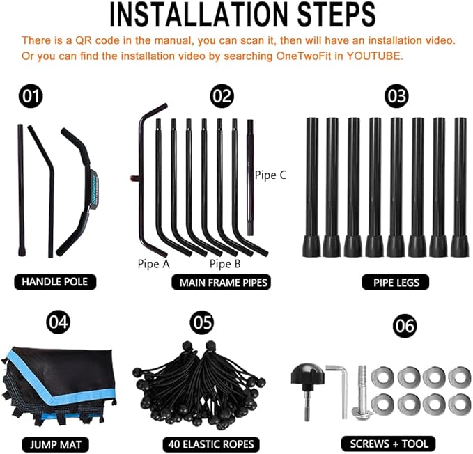 - 【NOTE】Trampoline equipment setup requires some physical labor-please read user manual or find the installation video by searching OneTwoFit in YOUTUBE for set-up and it is best having two people available set-up