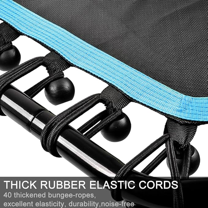 - 【Rugged Elastic System】Enjoy a spacious bouncing surface.The bungee-rope design system with 40 thickened ropes which are 0.32"(8MM) of diameter provides joint-friendly suspension, affords more stability, reduces noise in maximum extent, and gives you a great jumping experience. Special tool is included for assembly