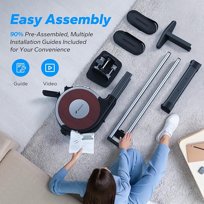 - asy Assembly, Convenient Storage & Quiet Operation: With 90% pre-assembly, the rowing machine can be set up in just 30 minutes. It’s easy to move and store thanks to built-in base wheels, allowing you to store it upright in just 1.6*2.1 feet of space. The quiet, smooth operation ensures you can work out without disturbing others, making it perfect for home use.