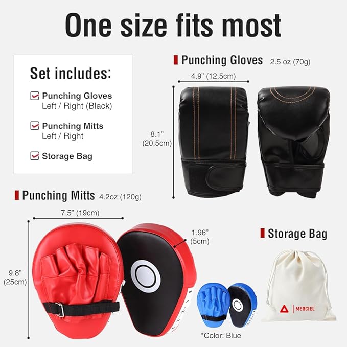 - 【SIZE (Approx.)】 - Gloves - Free Size, Mitts - Free Size,【WEIGHT(Approx.)】 Gloves (per hand) - 70g, Mitts (per hand) - 120g, 【SET CONTENT】 Punching Gloves Left/Right (Black), Punching Mitts Left/Right, Specialized Storage Bag, 【NOTE】 The Punching Mitts are interchangeable between left and right hands. (Both have belt fasteners on the left side)