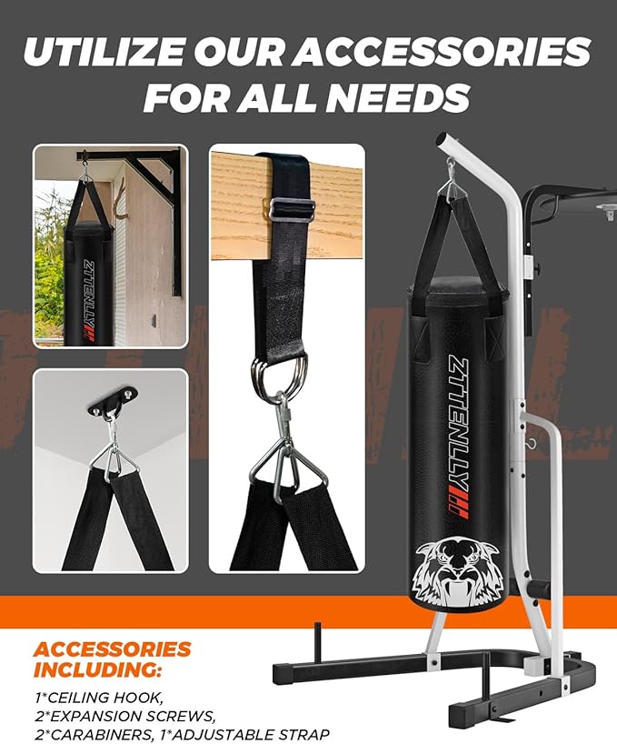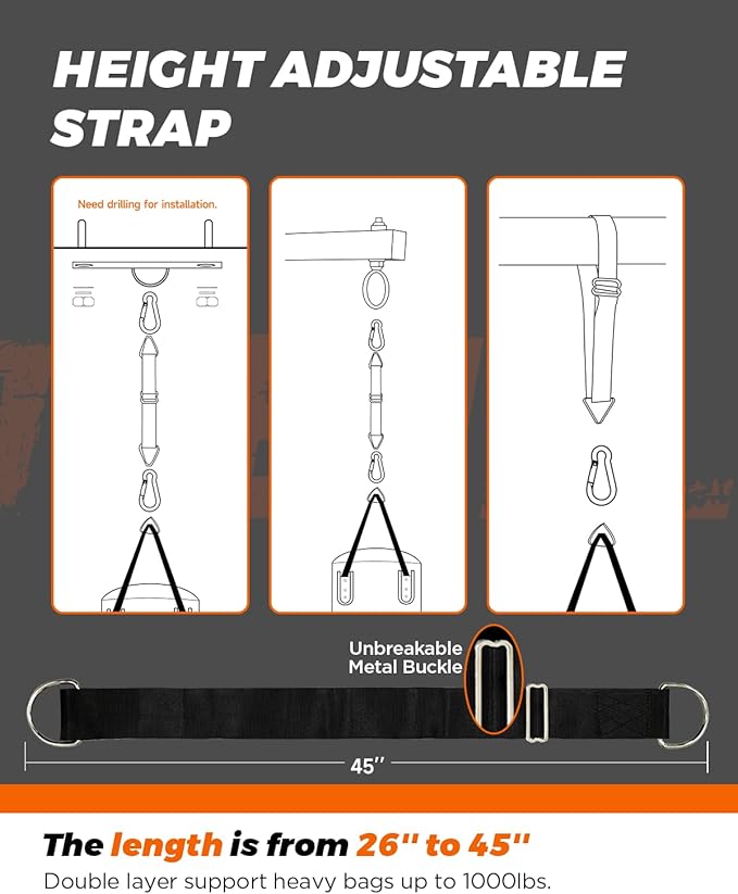 - EASY TO USE: Our boxing bag kit is easy to install and includes everything you need for any boxing scene. The complimentary adjustable strap is for your convenience and can be adjusted from 26" to 45", fitting everyone's needs easily.