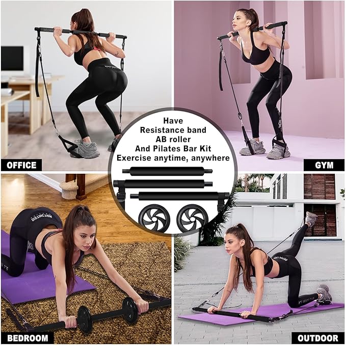 - 【Ultimate Pilates Bar System】The unique Pilates equipment completes a revolutionary innovation with a combination of detachable 3-bar and abdominal roller to complete regular Pilates training, plus the perfect abs workout, 8 high quality resistance bands, 4 20-inch and 4 28-inch. It Can meet 5' 1-6' 5 height people enough resistance training