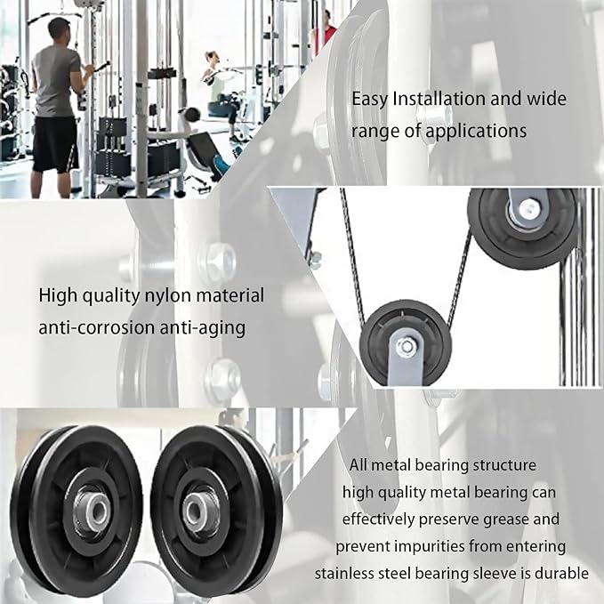 - Safety Performance and Stability - The nylon bearing pulley wheel is a great accessory of fitness equipment. There will be no friction spark because the nylon pulley wheels has a high safety performance and stability, which ensures easy movement.