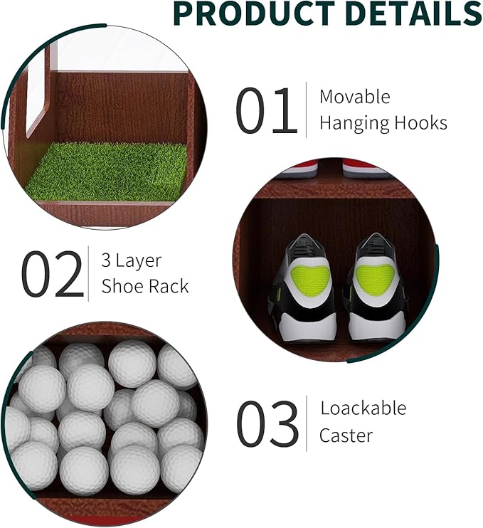 - Safe and Reliable: Compared to metal storage cabinets, the golf storage organizer made of high-quality wood can protect your golf clubs, preventing scratches and marks. Additionally, it comes with a lawn, providing an extraordinary visual delight whether placed in the garage, at home, or in the office.