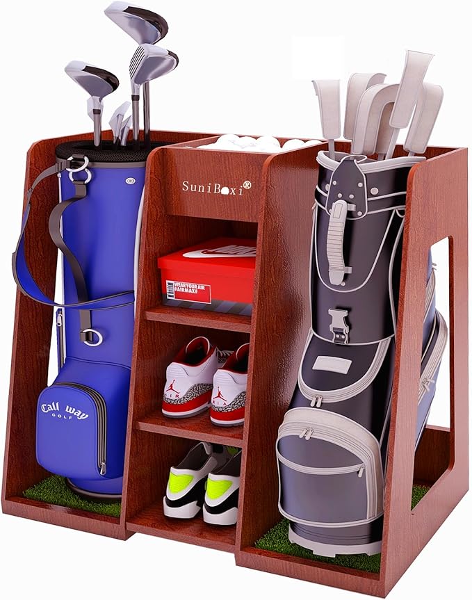 - Extra Large Capacity: Golf Bag Storage Rack allows you to neatly organize your golf accessories in a premium, modern-looking wooden storage cabinet that can accommodate 2 full-size bags, 4-5 pairs of golf shoes, and accessories. The assembly dimensions are 44.4" x 16" x 37"