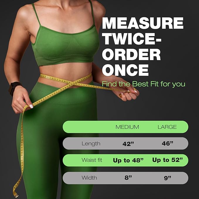 - Made To Fit - Easy to Carry, Convenient to Use. We designed two sizes so that we could include as many of you as we can. The Medium Size is 8" wide and 42" long, for an up to a 48" waist. The Large Size has an extra wide design at 9" wide and 46" long, for an up to a 52" waist.