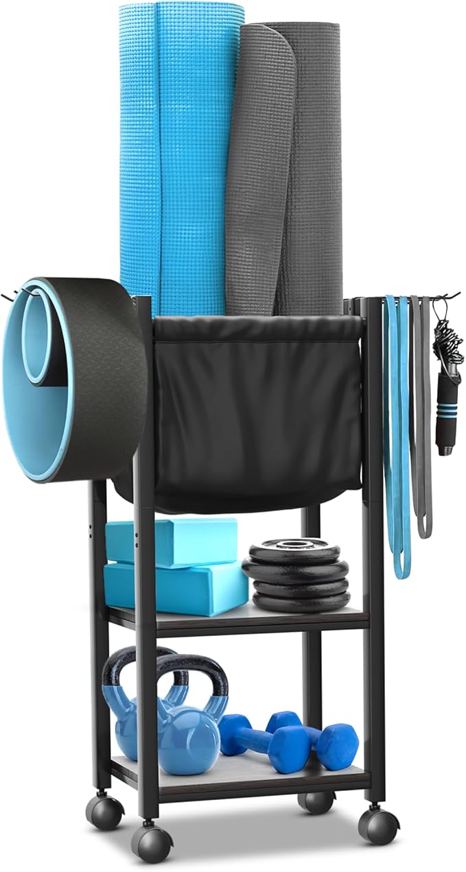 - UPGRADE YOUR FITNESS SETUP with our Gym Equipment Storage. This workout storage organizer has a black finish that complements any space. On top, there's also a special black bag for keeping things like yoga mats, your phone, and drinks handy