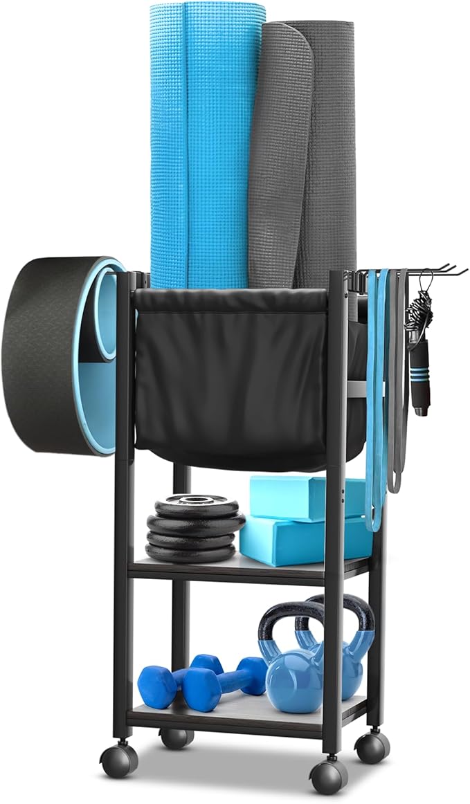 - PREVENT TANGLED GEAR by organizing your yoga straps, resistance bands, and jump ropes on the 6 side hooks of our yoga storage organizer. At 12"x 15"x 31.5", this indoor gym equipment will fit in any room, whether it’s a bedroom, garage, or living room