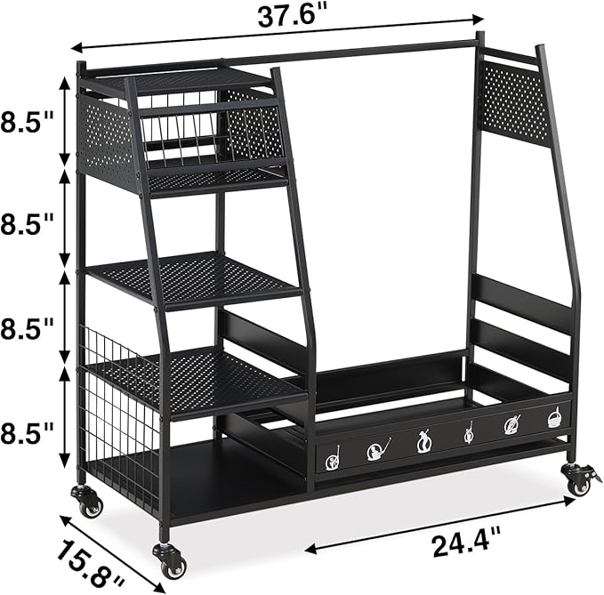 - Easy to Move & Stable When Stationary: The golf club storage stand with storage has 4 wheels that can rotate 360°, and you can push the garage storage stand to wherever you want. 2 of the 4 wheels can be locked, allowing flexible movement while maintaining sufficient stability in the placement position of the golf bag rack holder. The assembled freestanding garage storage station features 37.6'' L x 15.8'' W x 34.3'' H. Please measure where you want to put it before buying