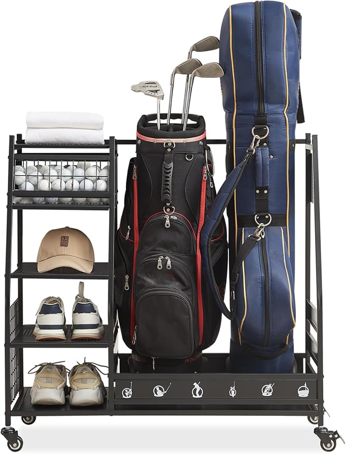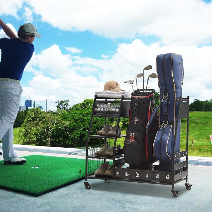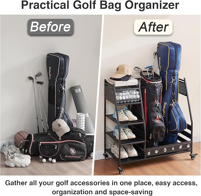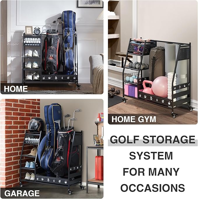 - Multi Occasions: Our golf bag storage can organize almost all your golf accessories, keep your sports and golf equipment in one place, say goodbye to cluttered garages, basements, homes, yoga studios, golf clubs, athletic departments, and storage rooms that are easy to access and space-saving. Christmas is coming up, this superior quality uniquely designed golf rack is the ideal gift for your boyfriend, husband or friends