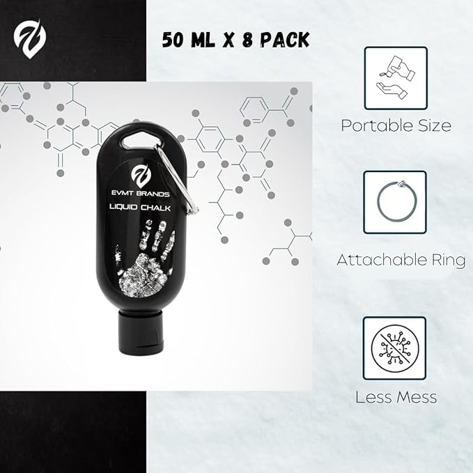 • High-Performance Liquid Gym Chalk – Fast-drying, mess-free magnesium carbonate formula designed to absorb sweat and improve grip; ideal for lifting, climbing, and dynamic movement exercises.