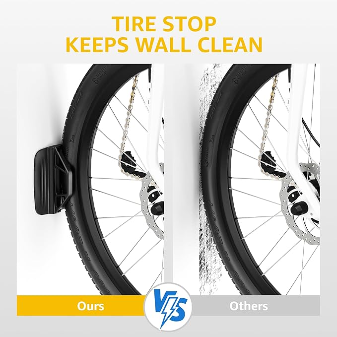 - 【Upgraded 150° Swivel Design】 Swivel design with bearing system, swivel bike rack wall mount conveniently stores bikes in center, left or right-angled position, making it a convenient storage solution around parked cars and inside apartments. The swivel system allows you to store bike flush against the wall. Just hook the front wheel in place, rest the back wheel on the stabilizer, and then rotate the bike wall hanger to the desired angle.