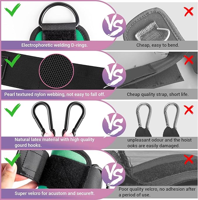 - [ANKLE RESISTANCE BANDS DESIGNED ONLY FOR WOMEN] Our ankle strap padding is made from a high quality neoprene material that wraps around your ankle in unparalleled softness and comfort. The matching three resistance bands are made of 100% pure natural latex, which is safer than regular synthetic latex. Best of all, the cool purple training poster we provide is easy to follow even for beginners!