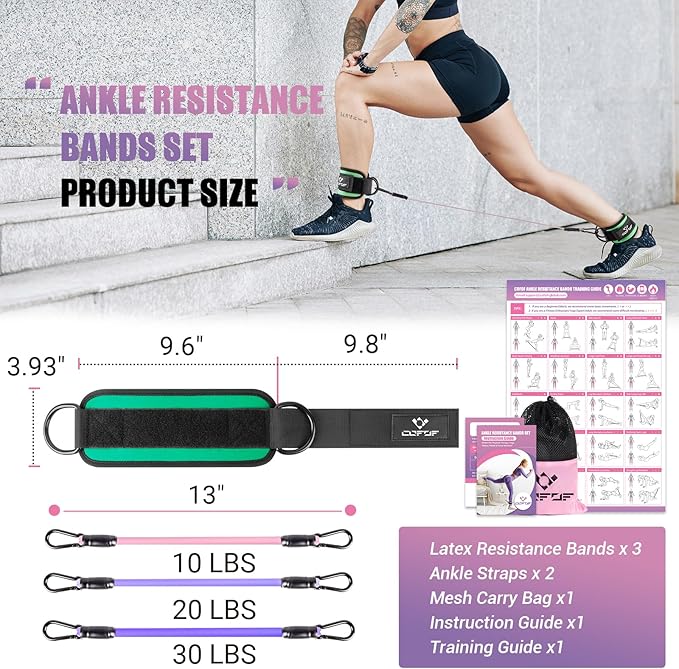 - [WORRY-FREE ANKLE BANDS SERVICE] We are always committed to allowing buyers to buy high-quality products while enjoying perfect services. Our Ankle Resistance Band Kit includes 2 Ankle Straps, 3 100% Natural Latex Bands, 1 Instruction Guide, 1 Training Posters and 1 Mesh Carry Bag. If you have any questions, please feel free to contact us.