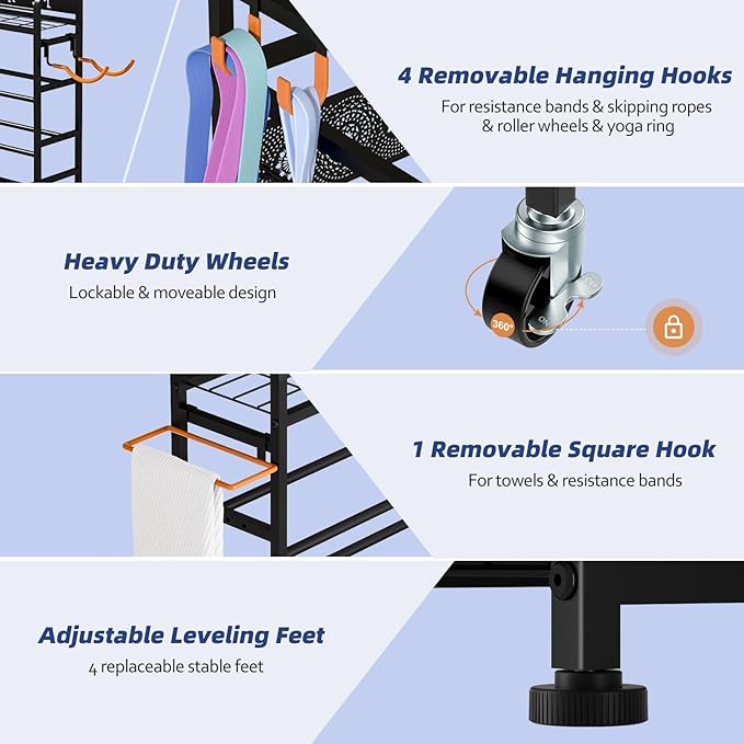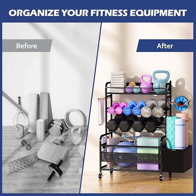 - Multi-Purpose Workout Equipment Organizer: This gym equipment storage can store dumbbells, yoga mats, kettlebells, yoga blocks, resistance bands, foam roller, ab roller, fitness rings, exercise balls, etc. Suitable for home gym, fitness club, yoga studio, garage, save space and keep your home gym tidy